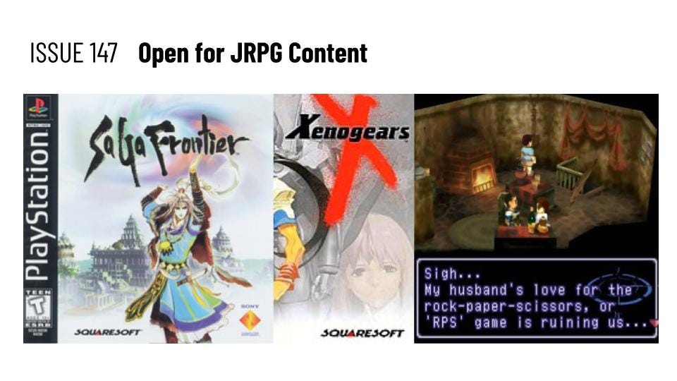 Issue #147: Open for JRPG ContentMiguelDec 01, 2020∙ PaidShareThis post is for paid subscribersSubscribeAlready a paid subscriber? Sign in