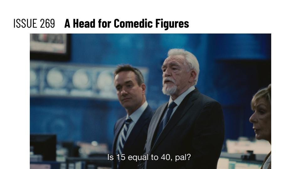 Issue #269: A Head for Comedic FiguresMiguelApr 04, 2023∙ PaidShareThis week, Succession continues to be worth writing about, so I continued to write about it. I had a busy weekend with some travel, so it’s words on “Rehearsal” and not much else this week. Next week, the sky’s the limit. This post is for paid subscribersSubscribeAlready a paid subscriber? Sign in