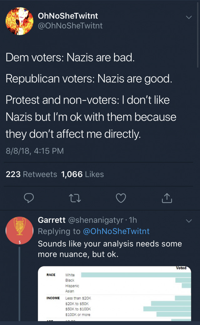 Seriously. It is so bad that it is immediately and unquestionably refuted in the first response, some of which is visible below. The counterpoint is summarized as thus: many people who do not vote make the choice precisely because they can’t feel any positive impacts when they vote and t…