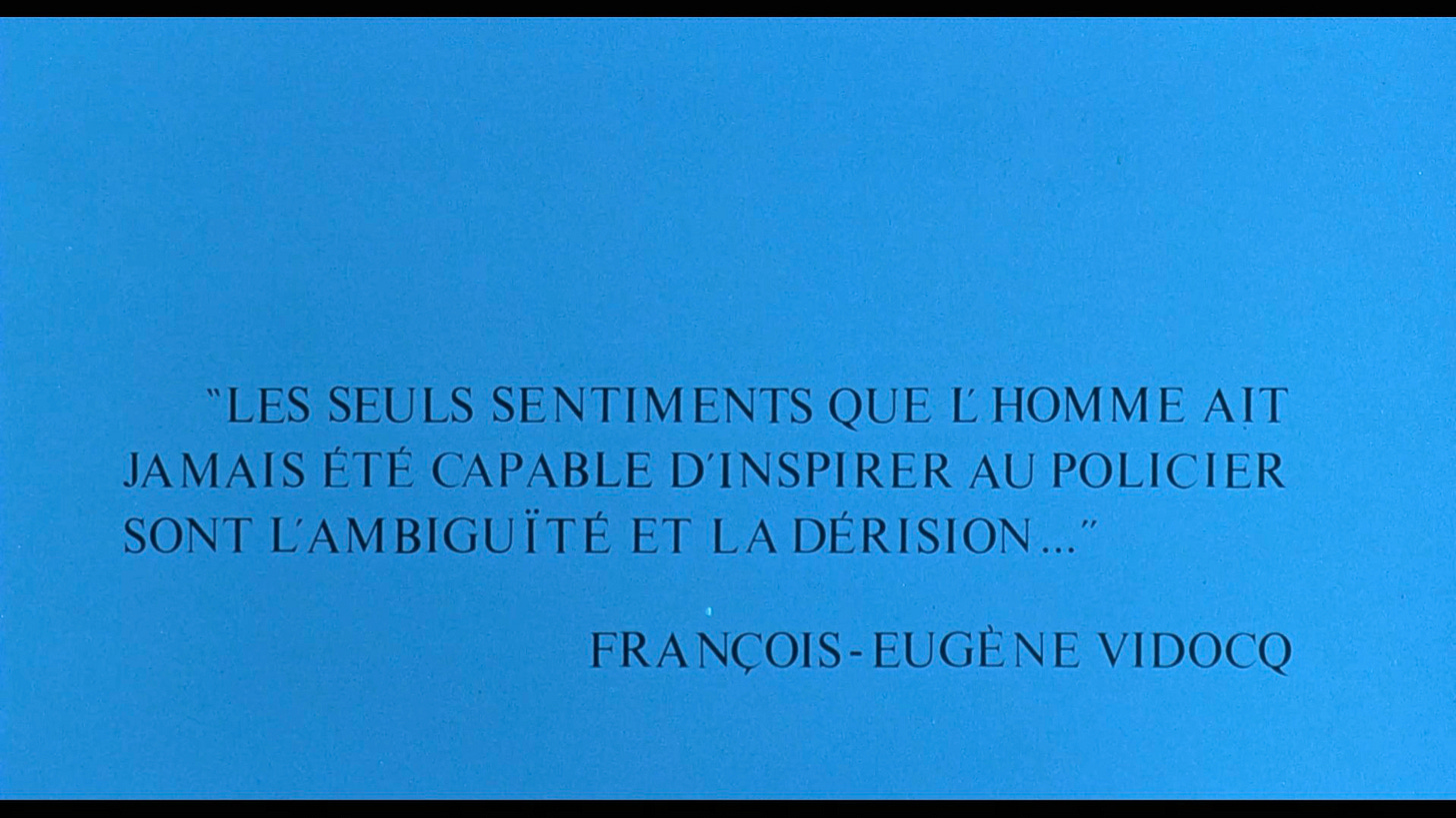 My examination of the two works begins with an ostensibly facile list of shared characteristics. Both films begin with some kind of epigraphic text card. In Le deuxième souffle: