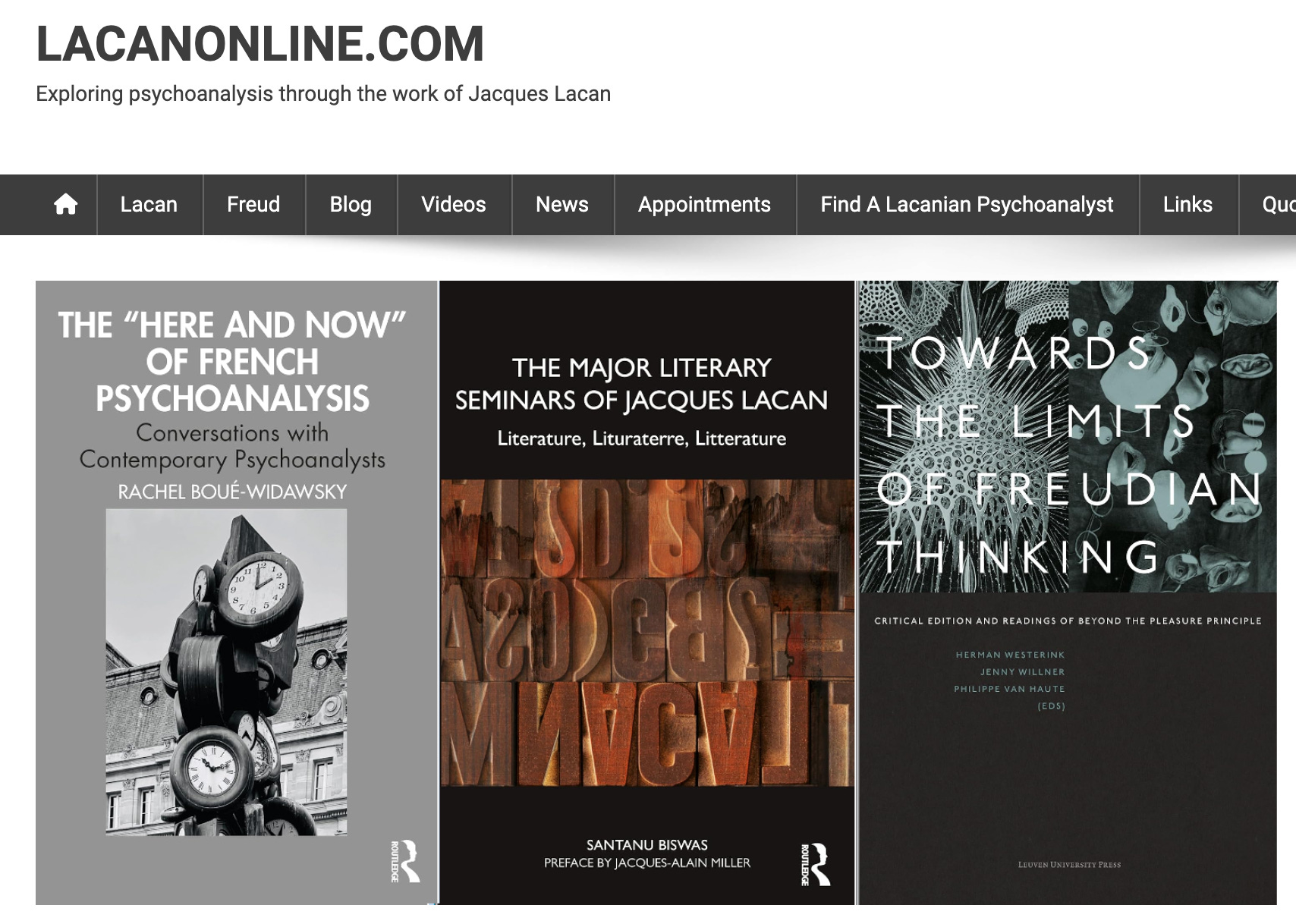 https://www.lacanonline.com/2024/09/news-august-2024/ — Owen Hewitson’s LacanOnline has posted its monthly news roundup for August. There’s a lot of great new Lacanian and psychoanalytic scholarship available, including Santanu Biswas’ The Major Literary Seminars of Jacques Lacan (2024) and the edited collection Towards the Limits of Freudian Thinking (2024), both of which I am reading right now. I am also anticipating Jean Allouch’s book, New Remarks on the Passage to the Act due out in English next year.