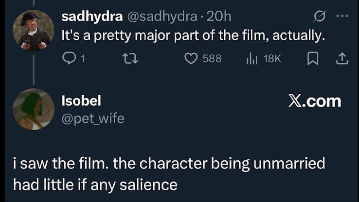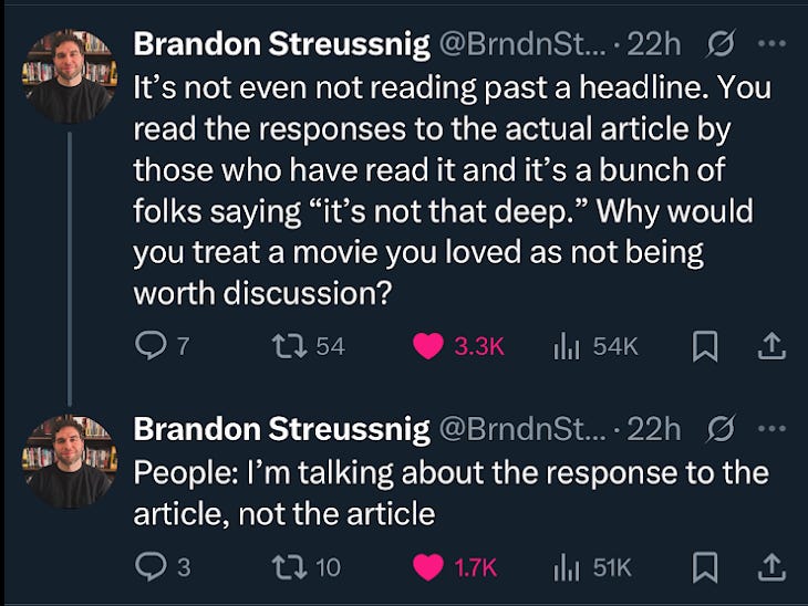 Cheap though it may be to attack someone’s reading with crummy tweets, disputes about how to interpret a film come up all the time. It’s a great thing. It is a little worse, however, to confront those who object to the idea of interpretation altogether.
