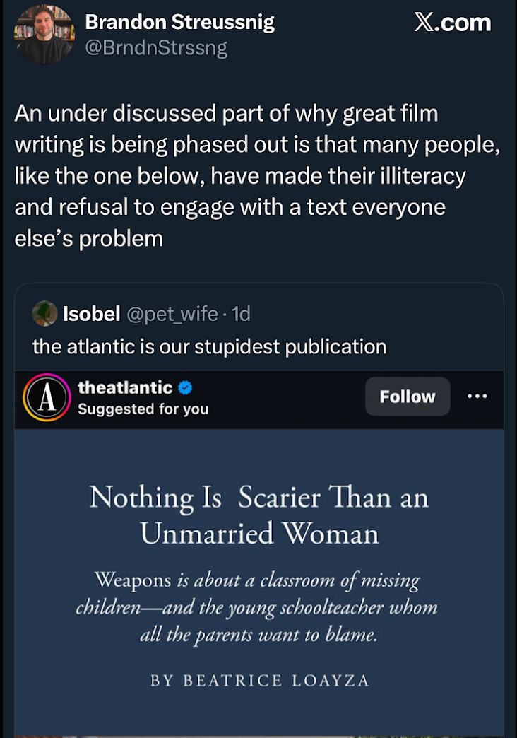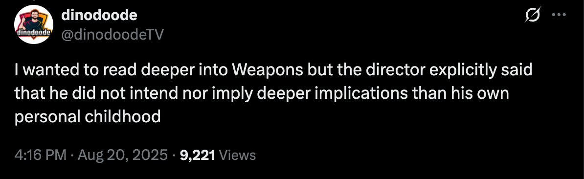 These are just some among many mistakes in thinking to curtail the freedom of the critic. “It’s not that deep” is the same as some of the objections to reading Weapons that I have heard, “it’s just dumb fun,” “it’s a film without a message.” Making such a claim requires substantial analysis to support it. To assert a film is without a message is to read it, exhaustively, for any subtext and find nothing. Of course, people who make this claim likely didn’t self-consciously think about Weapons, for example, and find it lacking. But it is an interpretation that would require support if to advance. And such an argument won’t hold up under scrutiny, since Weapons makes available all kinds of readings rather than makes impossible any kind of reading.