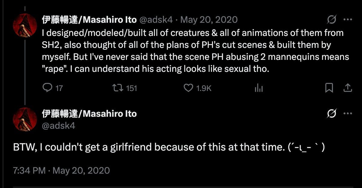 I have some sympathy for Ito, the idea of Pyramid Head’s sexual signification is documented on Wikipedia (at the time of posting) without attribution to a particular critic. And it does seem tiresome to have to defend one’s game against conspiratorial claims about apocryphally cut content. Ito is making a mistake in failing to distinguish between the interpretive and empirical claims about his game. It’s not that they aren’t related. The idea something might’ve been cut from the game is a search for some kind of interpretive smoking gun for those less comfortable with ambiguity. And maybe the reading of Pyramid Head’s relationship to James’ sexuality is poor or juvenile. But Ito is having an absolute meltdown, encouraging the worst ideas about how someone should interact with and derive meaning from the art they encounter. And, as they say, a hit dog will holler. Not to suggest Ito himself consciously embedded some idea of sexual antagonism into the design of Pyramid Head, but he says this analysis of the game has plagued him for over two decades.