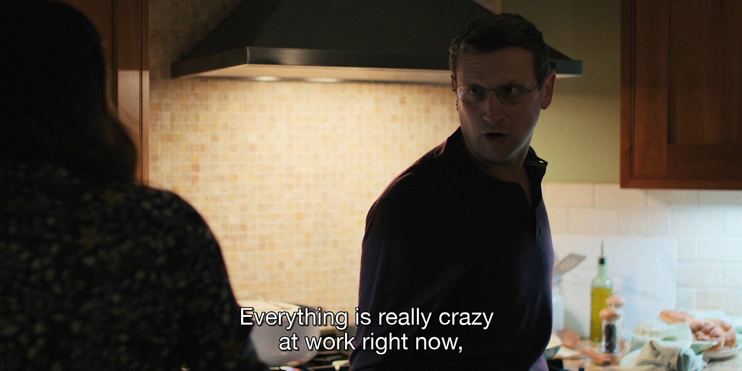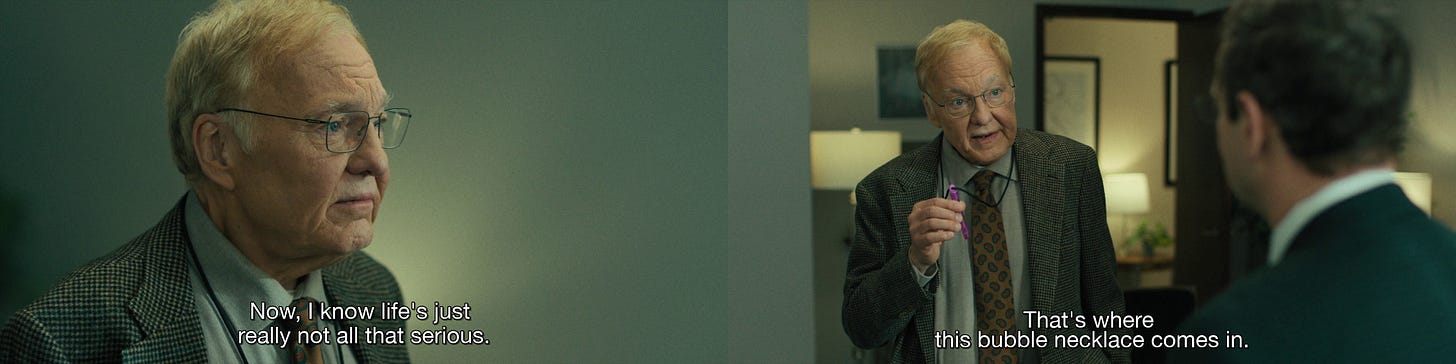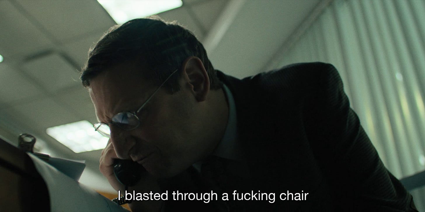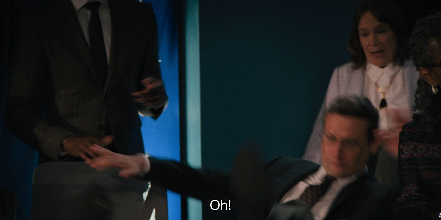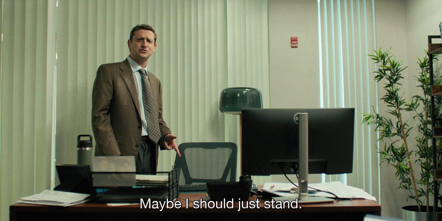 This brings me to the latest in prestige comedy, The Chair Company (2025). From Tim Robinson and Zach Kanin, the show will be familiar to those who have seen the duo’s I Think You Should Leave (2019) or Robinson’s Friendship (2024) directed by Andrew DeYoung. DeYoung also handles directing duties for this first episode of The Chair Company, “Life goes by too f**king fast, it really does.”