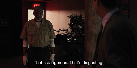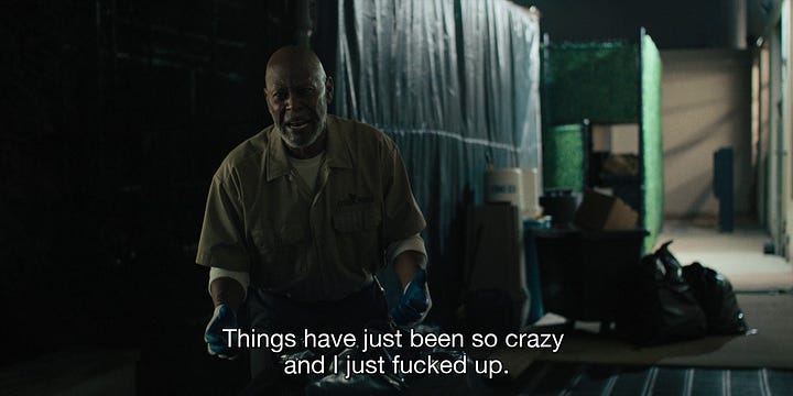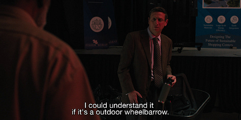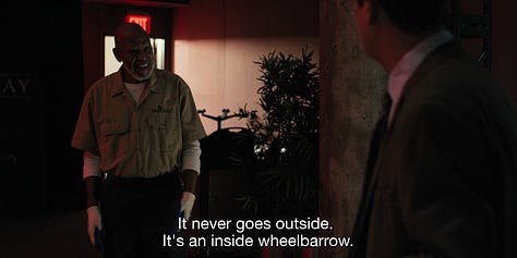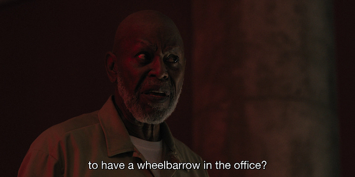 Robinson’s “comedy thriller” is, watched scene by scene, almost indistinguishable from I Think You Should Leave. There’s an ongoing bit involving a wheelbarrow, given some room to breathe that the sketch format would not have afforded it. An unnamed janitor who confronts Ron Trosper (Tim Robinson) believing Trosper to be someone attempting to stop him from using a wheelbarrow indoors.
