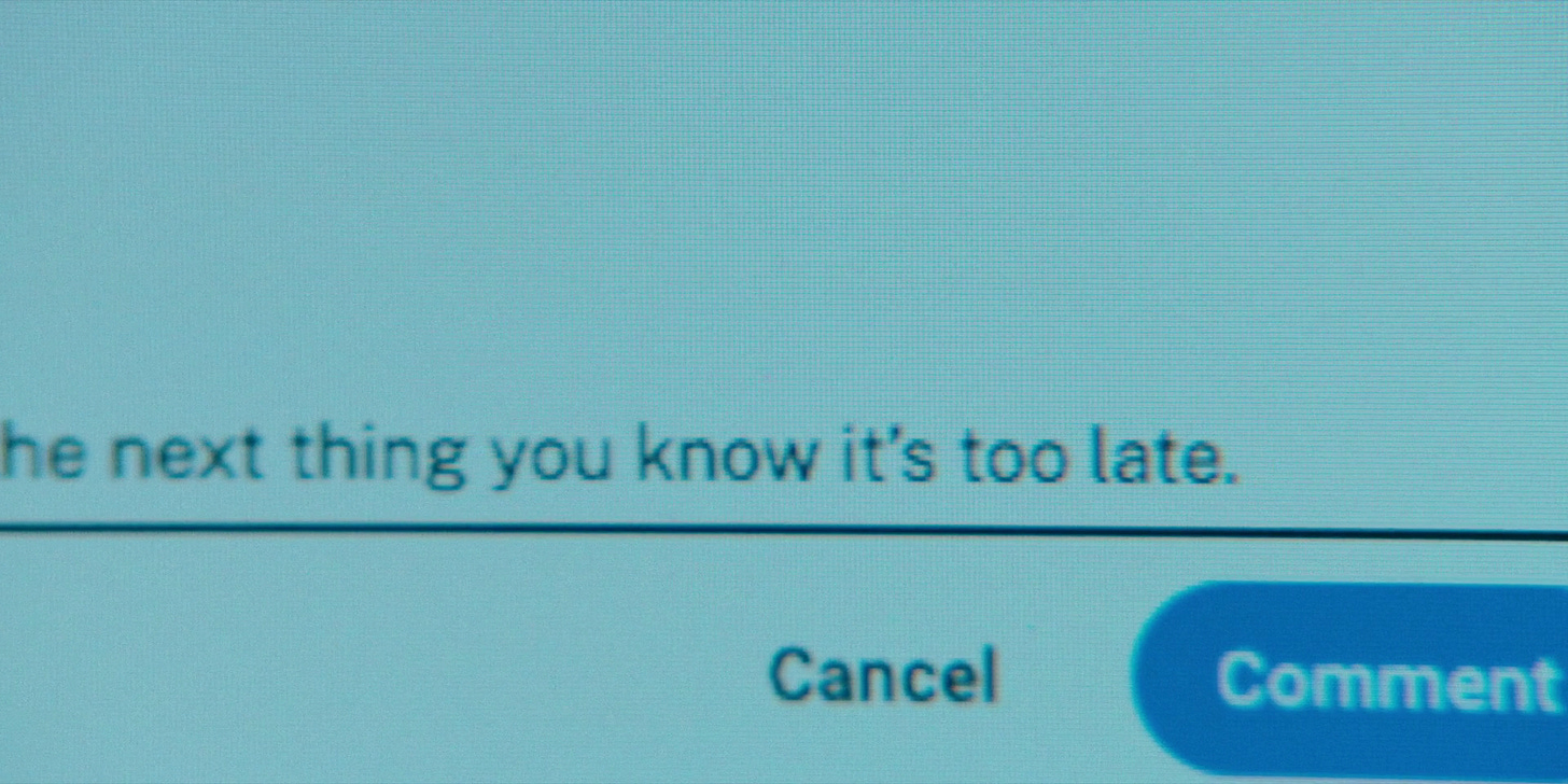 In another, Trosper works on a slide show for his daughter’s rehearsal dinner moved by the song “I Have a Name” by Jim Croce. He tears up from the combination of the song itself and a comment on the youtube video, “life goes by so fucking fast.” He leaves a comment of his own, “It really does go by so fucking fast. You think you’re gonna do something with your life and the next thing you know it’s too late.”