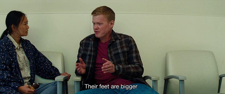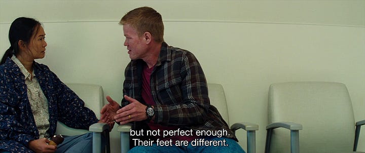 Not for nothing, Lanthimos seems to have a fixation on the foot as an indicator of difference, as Liz’s foot size and Michelle’s toe length are equally at issue in illustrating their duplicity. In Bugonia and “R.M.F. Is Flying,” Teddy and Daniel assemble irrational belief structures based on meaningless pieces of evidence. Their desire sutures together these pieces in place of reason. But this kind of structure, for Lanthimos, leads to an even more profound truth.