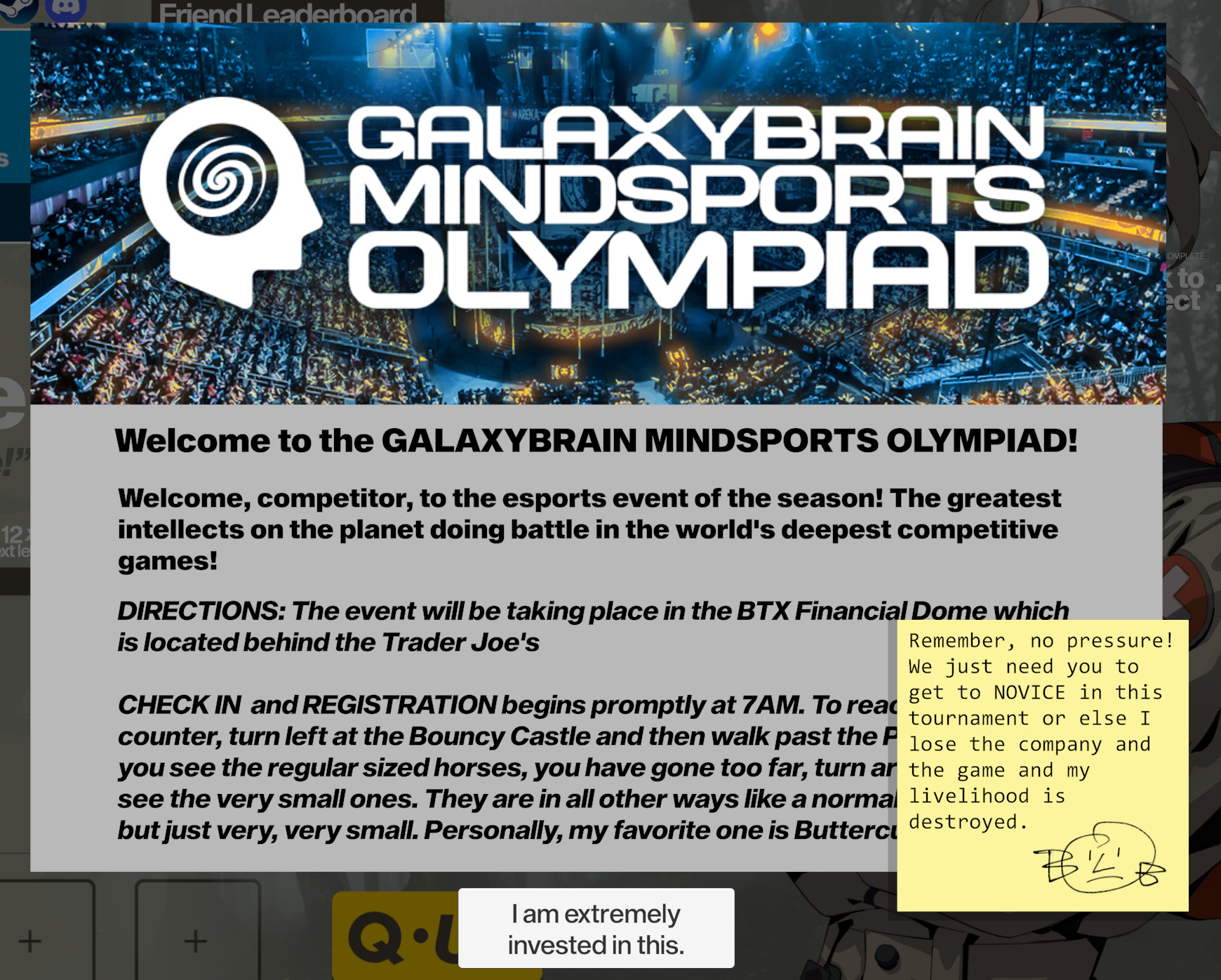 Q-Up is also funny, satirizing esports, corporate office life, and gaming culture. Many of the jokes are also thought provoking and relate to the game’s themes. Because the game presents first a puzzle of what it even is, the player will always ask “where is the game here?” before doing anything else. Q-Up continues to explore the nature of gaming with both its humor and mechanics. This is at least reasonably thought through by the developers. As Lantz says:
