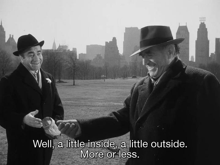 Despite an uncharacteristically un-festive Noirvember, I got a chance to see Odds Against Tomorrow (1959) last night. It’s a great, great film, but with a very overt didactic message. In it, Earle Slater (Robert Ryan), Johnny Ingram (Harry Belafonte), and Dave Burke (Ed Begley) plan a heist of a small town bank. Burke, a disgraced police office, is the mastermind. The film focuses on Slater and Ingram, two characters who are juxtaposed against one another like Guy (Farley Granger) and Bruno (Robert Walker) in Strangers on a Train (1951). Robert Wise avails himself of repeating the same scene, first with Slater, then Ingram, as opposed to using Hitchcock’s cross-cut. The opening emphasizes their difference. Slater is rude, leaning toward desperate, and, critically, heinously racist. Ingram is charming and well put together. Burke sells to Ingram harder, yet Ingram is a tough sell. Burke says, “you don’t look like I could sell anything to you.” The pitch is the robbery, but Slater’s prejudices mean he won’t work with Ingram. Ingram has a more sympathetic objection, “That’s for junkies and joyboys. We’re people.”