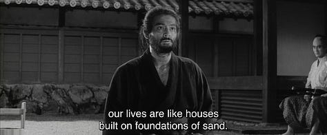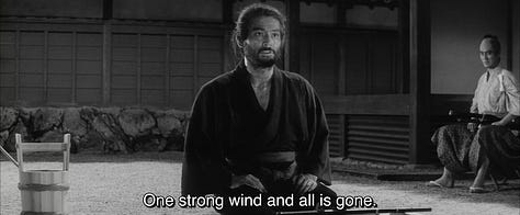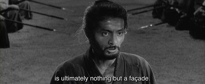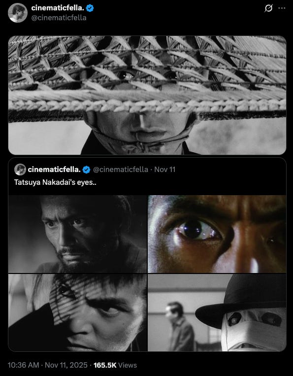Nakadai’s importance to me should be already obvious from how often he and his films have come up in the newsletter. To this point, I’ve linked to four essays about Nakadai’s films. I made a case for Nakadai as the GOAT just four months ago. I even wrote about Harakiri in connection with my marriage last year.