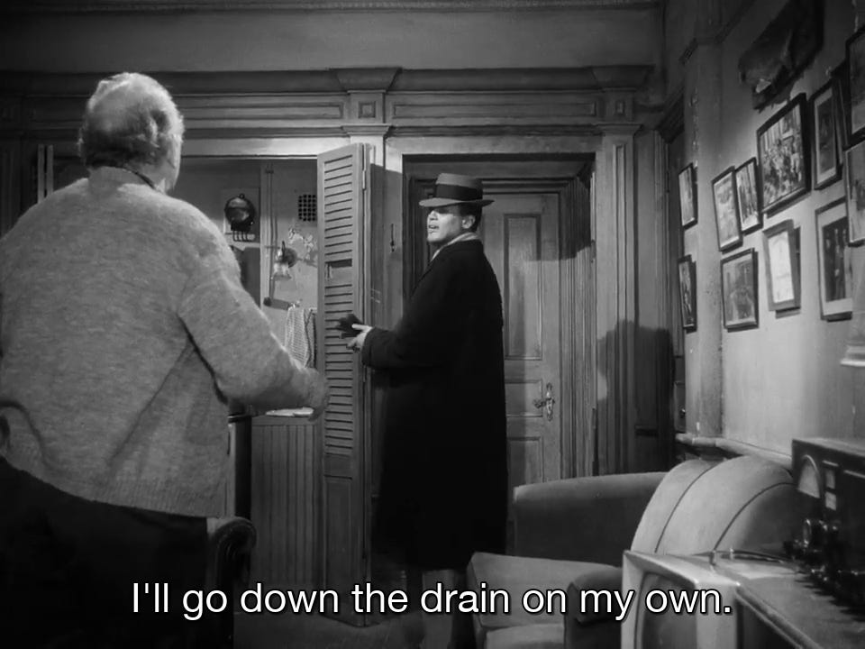 Slater, on the other hand, is moved to throw his hat in with Ingram and Burke for reasons as confusing as they are offensive. He is humiliated by his girlfriend Lorry (Shelley Winters) paying his bills. Beyond the incomprehensible misogyny, meant I think to appear unsympathetic even to a late 50s audience, there is some genuine pathos in Slater’s fear that if he is unable to provide financially, Lorry will leave him.