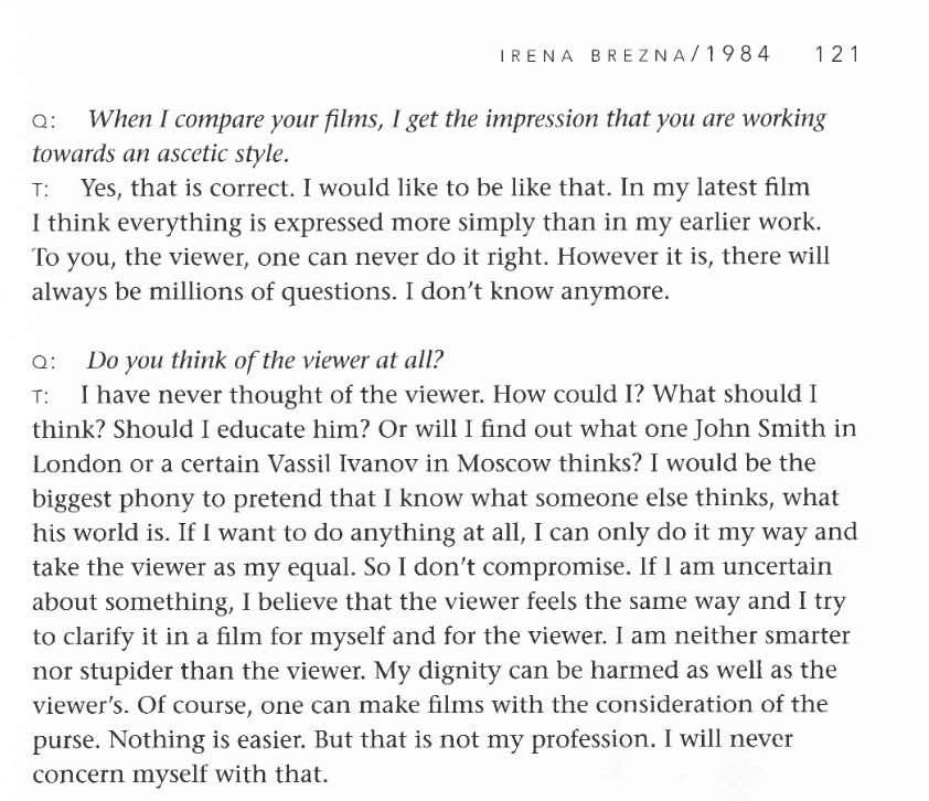 Finally, I want to share this bit of a Tarkovsky interview from his volume of translated interviews, published back in 2006: