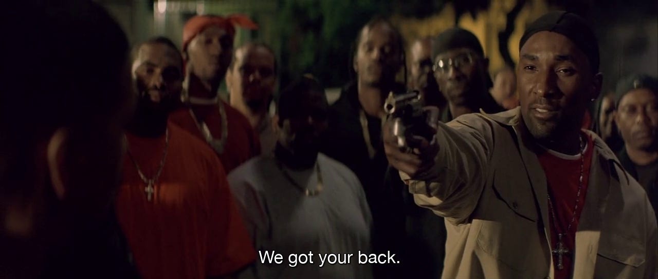 One might consider how Training Day is a reactionary film in the same, routine sense as Hollywood cinema and how it is exceptional in its promulgation of, say, antiblackness. Fuqua’s film is not unusual in its ultimate endorsement of the proverbial “good cop” who triumph’s over the “bad apples.” Sexton writes of the near-final scene where Bone tells Jake, “We got your back”: