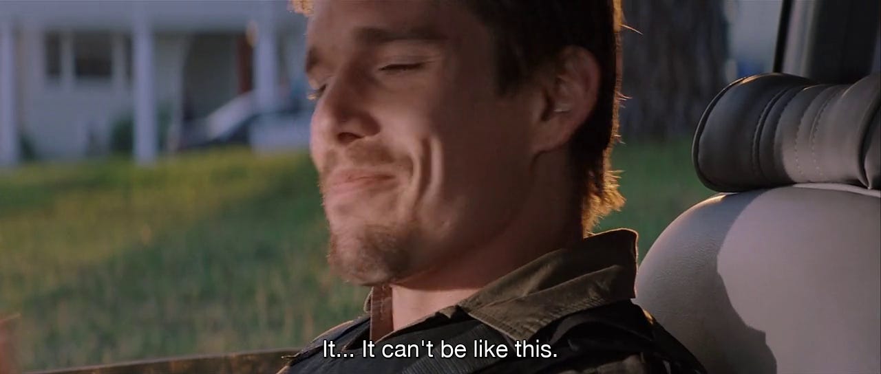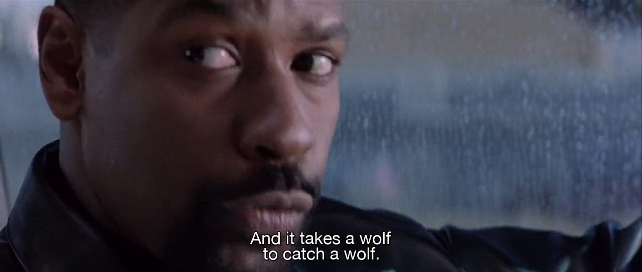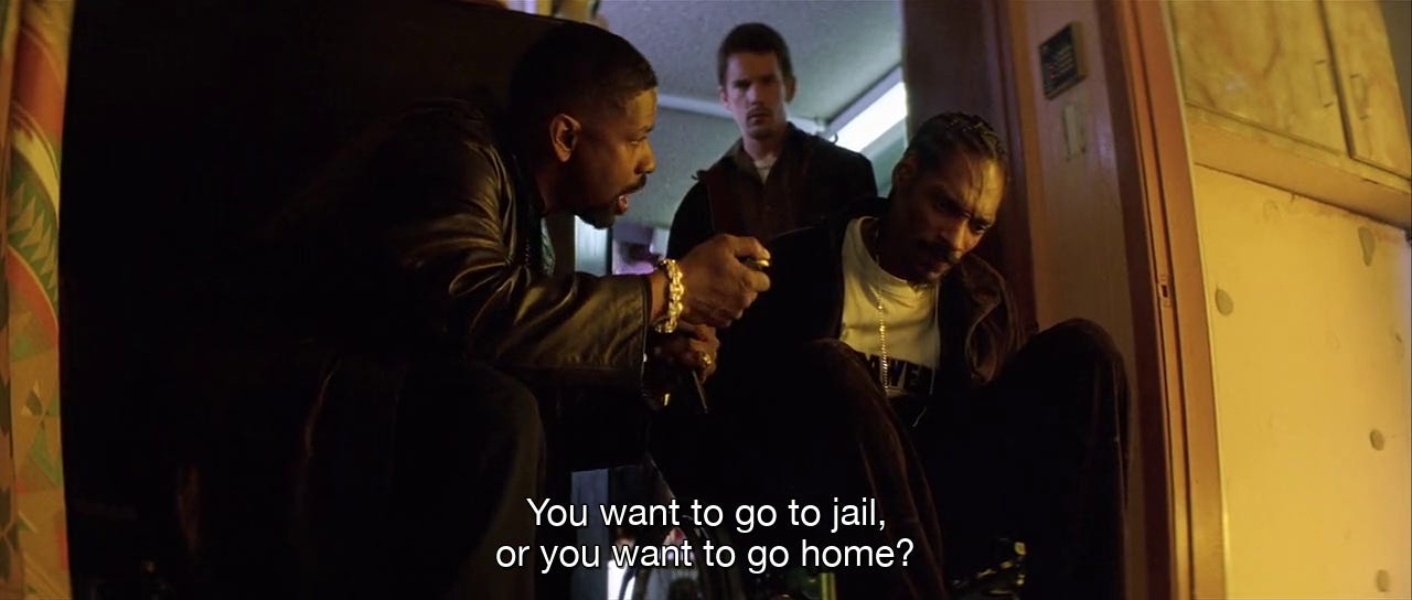 What is Training Day, really, aside from a gritty actor’s proving ground loosely adapting the LAPD’s ill repute? Coming to an understanding like this starts and ends with Alonzo Harris. Washington says, “[H]e’s done his job too well. He’s learned how to manipulate, how to push the line further, and in the process, he’s become more hard-core than the guys he’s chasing.” In the director’s commentary, Fuqua is clear in establishing that Harris’s attitude about crime — “it takes a wolf to catch a wolf” — is earnest. But he also repeatedly describes Harris as the devil and characterizes his relationship with Hawke’s Jake Hoyt as Faustian. Hoyt, says Fuqua, has the tragic flaw of ambition. He points to the line early in the film where Hoyt says, “You should see those guys’ houses,” referring to LAPD division leaders. That line also reveals something else: corruption that is endemic to the order of Law. This is Training Day’s most enduring message: criminality is a feature, not a bug, of law enforcement. This excluded and covered over element of crime is necessary for the functioning of society’s Law as such.