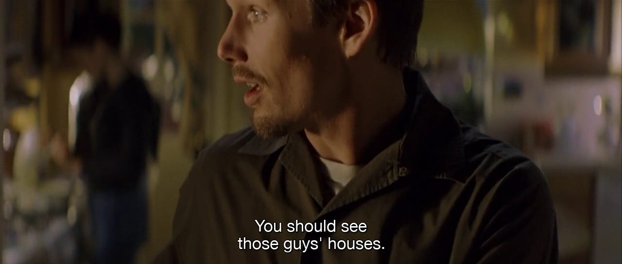Ironically, Sexton’s condemnation of Fuqua’s “image-track of urban fear and loathing” (22) aligns him with the studio executives, who, according to Fuqua’s account in the film’s director’s commentary, objected to the film’s ‘gritty’ presentation of ‘the streets.’ From Fuqua’s perspective, Training Day represents an unfiltered, unsanitized version of life in some LA neighborhoods. It is remarkable, then, just how much of the film is dedicated to conversations between Hawke and Washington in frames that are dominated by their visages in close-up.