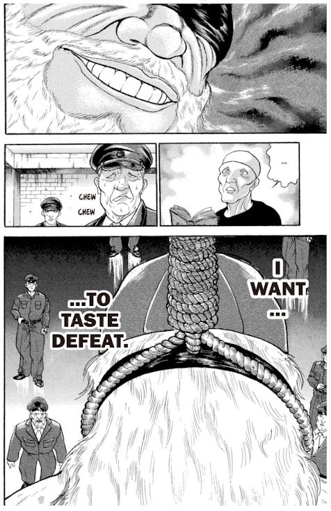 It is impossible for me to escape the gravity of the “Most Evil Death Row Convicts Saga,” the opening arc of the Baki manga (the second serialization) and the 2018 Baki TV series. I re-read it often. The story takes place after Baki is victorious — beating Jack — in an underground martial arts tournament that establishes Baki as the greatest fighter in Japan (except for Yujiro). Baki, like many other works in its genre, dedicates a great deal of time considering the difference between fighting for sport and fighting for survival. Underground, illegal combat tournaments tend to be closer to the latter. There is something limiting, in Itagaki’s view, about fighting for people’s entertainment as a public athlete. The self-serving motivation is counter to what Itagaki seems to value about any practice.