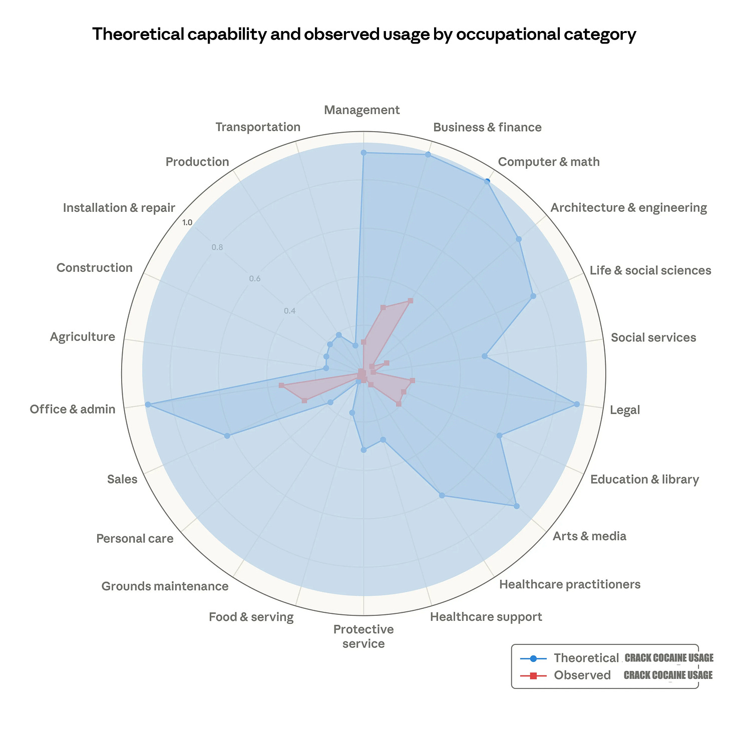Though I’ll mock Anthropic for their transparent, self-serving advertising in the guise of economic analysis, it is not as if there is nothing interesting to be be gleaned here. Most fascinating is the organizations of the vocations themselves. “Grounds maintenance” has the smallest “Theoretical AI coverage,” while “Business & finance,” “Computer & math,” and “Office & admin” are among the largest. “Arts & media” (vomit) are also scored highly by Anthropic for their theoretical coverage, although it seems to me they overestimate the degree to which AI is used in the “production” of “Arts & media.” I don’t think “AI art” is making anyone any real money.