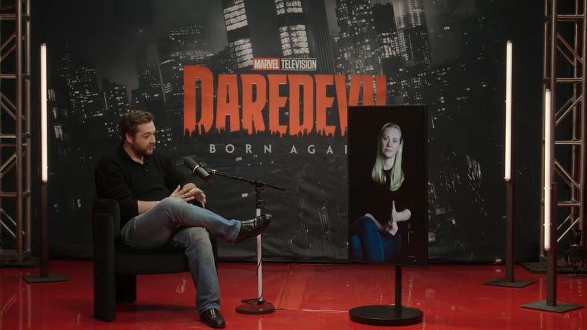 Bracketing the AVTF-ICE parallel, there are other symbolic parallels in Born Again’s second season. The Born Again Official Podcast’s companion to “Shoot the Moon” has Deborah Ann Woll, who plays Karen Page, discussing the character motivations with Michael Gandolfini, who plays Daniel Blake. Woll says: