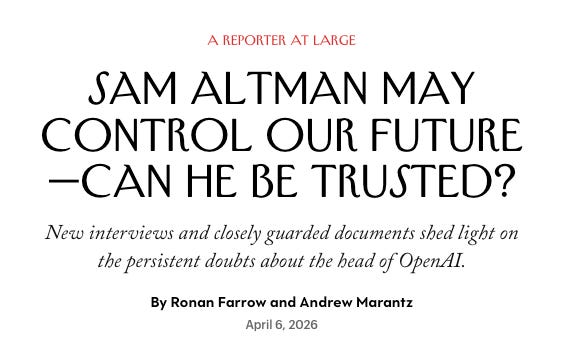 https://www.newyorker.com/magazine/2026/04/13/sam-altman-may-control-our-future-can-he-be-trusted — Ronan Farrow and Andrew Marantz come up big on the AI beat.