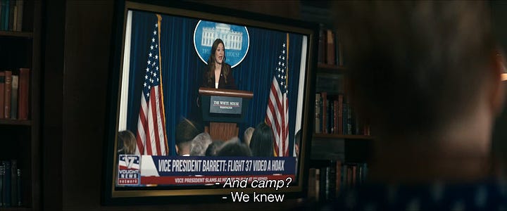 I have never found The Boys to be particularly incisive when it comes to political satire, although it has its moments. In addition to the comedic dimension of the show, The Boys is often an edgy soap opera focused on internecine personal conflict among allied characters. Now in its fifth season, the fourth of eight episodes airing this week, The Boys remains more soap opera than satire. “Fifteen Inches of Sheer Dynamite,” the fifth season premiere, bucked the prevailing trend with some fascinating television.
