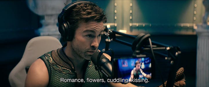 Of course, a showrunner with the aesthetic sensibilities of Hot Topic, Invader Zim (2001), and Deadpool comics can’t help but be too cute. When screenwriter Paul Grellong has The Worm (Ely Henry) deliver a meta-monologue on final seasons, I had to laugh. His complaints as an in-show writer of a Reacher spec script (the real show Reacher, like The Boys, is an Amazon Prime exclusive streaming series) are both astute and funny: