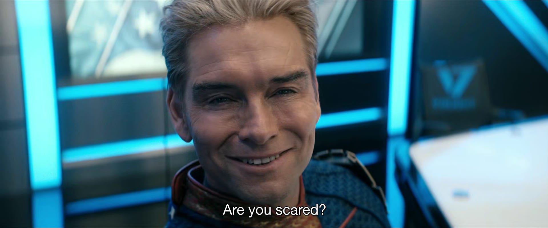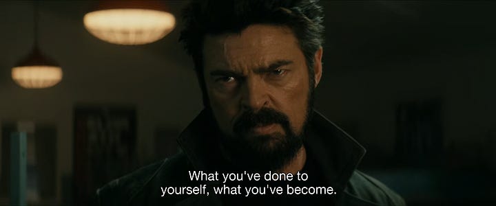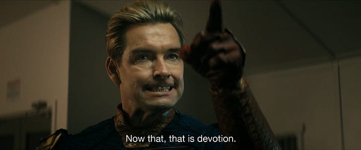 This positions him awkwardly, relative to Butcher. Though Butcher does not revere him, he also does not fear him. And the devotion that Homelander identifies in him is a devotion to attempting to annihilate his arch nemesis. Cue Heath Ledger’s Joker, “you complete me.”