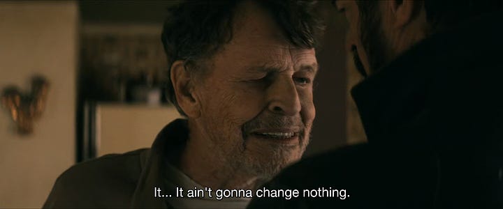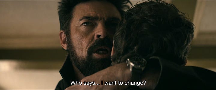 Butcher’s world tour of recruiting displaced characters also brings him to his abusive father Sam (John Noble). It is in conversation with Sam that the show communicates Butcher’s arrested development, stuck because of his father’s abuse. Characters like Campbell, A-Train (Jessie T. Usher), Starlight (Erin Moriarty), and Kimiko (Karen Fukuhara) are dynamic. Butcher and Homelander, by contrast, cannot change. It is both because of their inextricable antagonism and their traumatic childhoods. After interrogating Homelander’s childhood in the previous season (particularly “Wisdom of the Ages”), Butcher and Sam’s last caress lays plainly that Butcher will end the show in the same place he begins it: “Who says I want to change?”